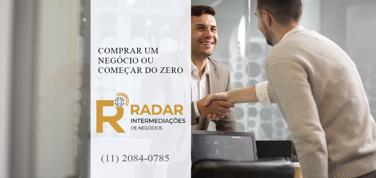 Seja qual for o seu perfil, a decisão de comprar um negócio ou começar do zero fica mais segura com apoio de especialistas. A Radar Intermediações tem mais de 25 anos de experiência conectando empreendedores a oportunidades de negócio sólidas.